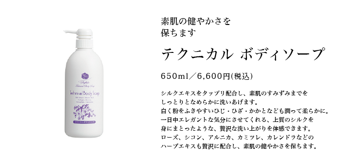 シルクエキスをタップリ配合し、素肌のすみずみまでをしっとりとなめらかに洗いあげます。