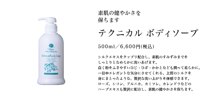 シルクエキスをタップリ配合し、素肌のすみずみまでをしっとりとなめらかに洗いあげます。