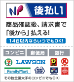 ○このお支払方法の詳細 商品の到着を確認してから、「コンビニ」「郵便局」「銀行」で後払いできる安心・簡単な決済方法です。請求書は、商品とは別に郵送されますので、発行から14日以内にお支払いをお願いします。 ○ご注意 後払いのご注文には、株式会社ネットプロテクションズの後払いサービスが適用され、同社へ代金債権を譲渡します。 NP後払い利用規約及び同社のプライバシーポリシーに同意して、後払いサービスをご選択ください。ご利用限度額は累計残高で54,000円(税込)迄です。詳細はバナーをクリックしてご確認下さい。 後払い手数料は「無料」です。 [ NP後払いご利用規約及び同社のプライバシーポリシー ] |